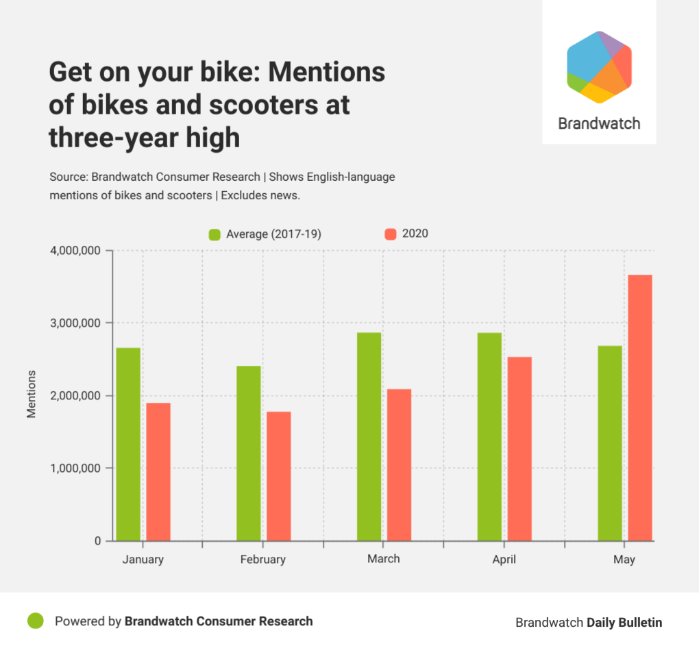 Looking at mentions from March 1 to May 31, we found consumers were buying two wheels to adapt to life in the wake of Covid-19. Consumer Research found 592k social media mentions from people ditching public transportation for a bike or scooter. Another 491k mentions came from people who were grabbing some wheels because they thought it was a safer way to get around.