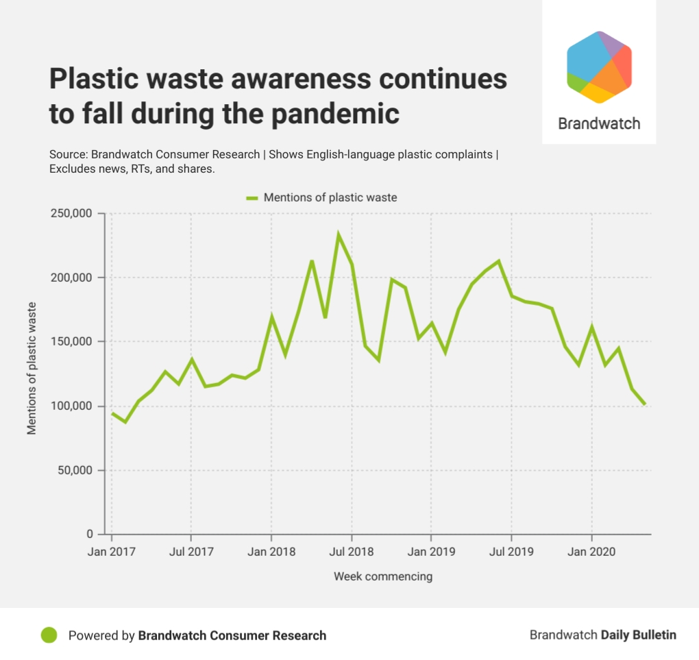 Today we’re checking in on general complaints about plastic. Using our Consumer Research platform to investigate English-language mentions on social, we found conversation decreased 36% in March, April and May, compared to the same period in 2019.