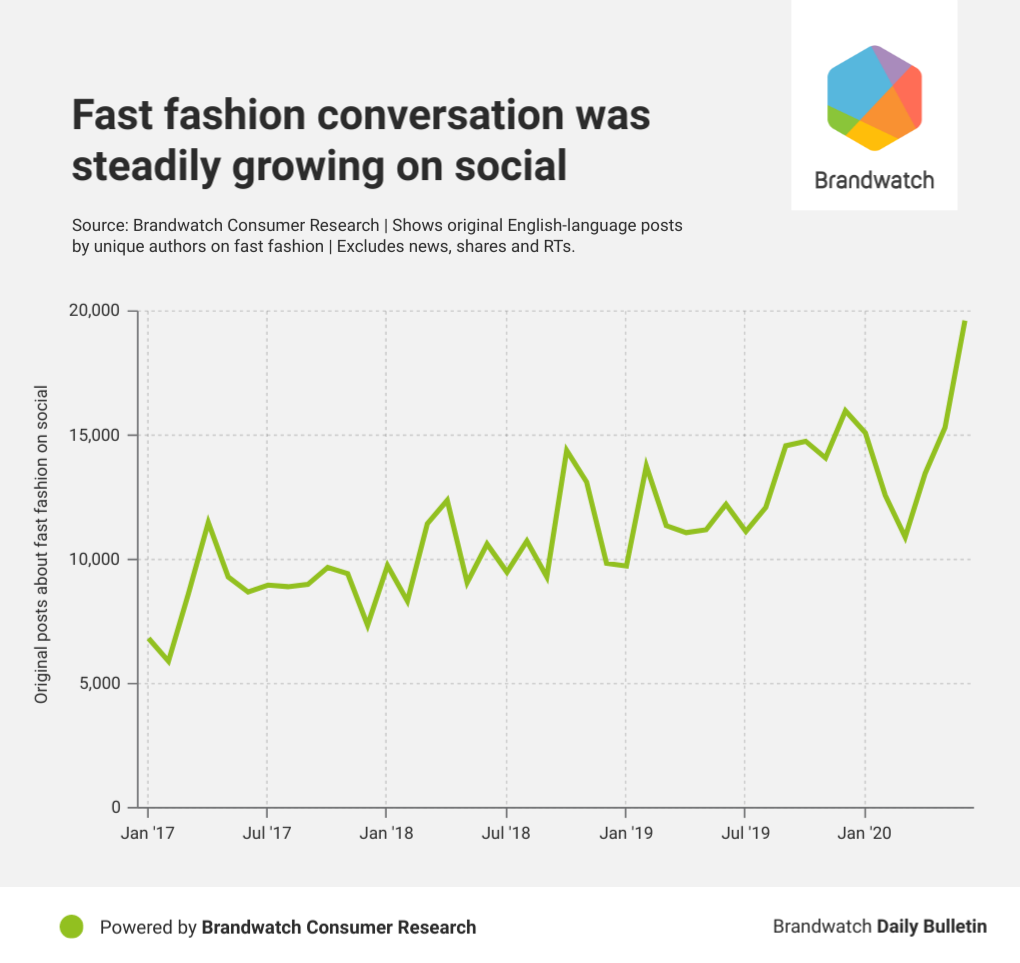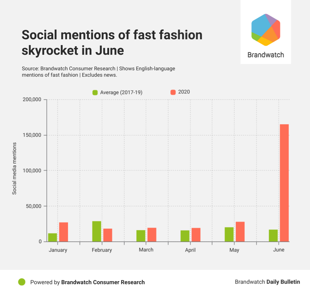People have become more aggressive when demanding change, provoked by a 97% increase in media reports on fast fashion in June in comparison to May. These stories referenced sweatshops producing clothes for some of the largest fast fashion brands in the world and orders being left unpaid by corporations, according to BuzzSumo.