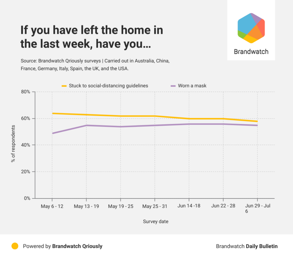58% of consumers across Australia, China, France, Germany, Italy, Spain, the UK, and the USA are sticking to social distancing guidelines when they leave the house, according to a Brandwatch Qriously survey conducted between June 29 and July 6. That’s a 9% decrease on the results we got the first time we asked about this back in May.