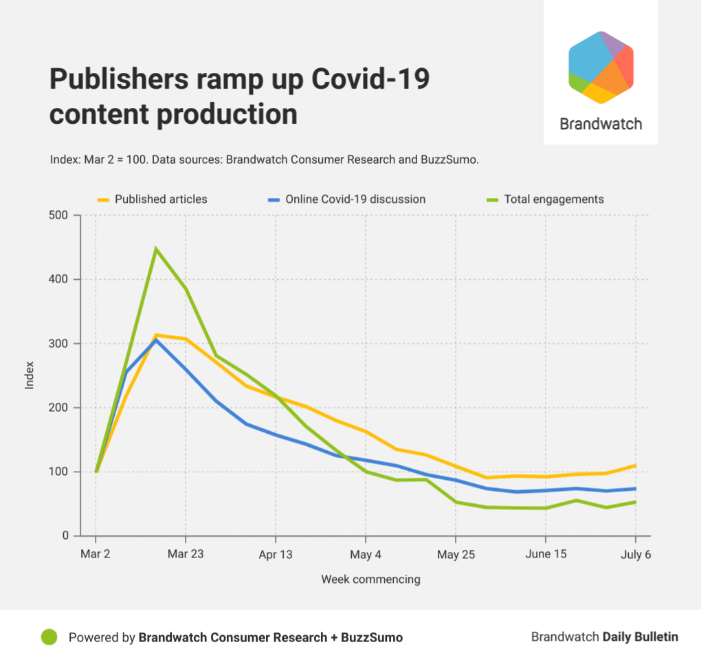 There’s some more significant movement when it comes to Covid-19 articles, though. The number of these increased by 13% last week, the biggest increase we’ve seen since mid-March. Publishers seem to be increasing the resource they’re putting into Covid-19 content.