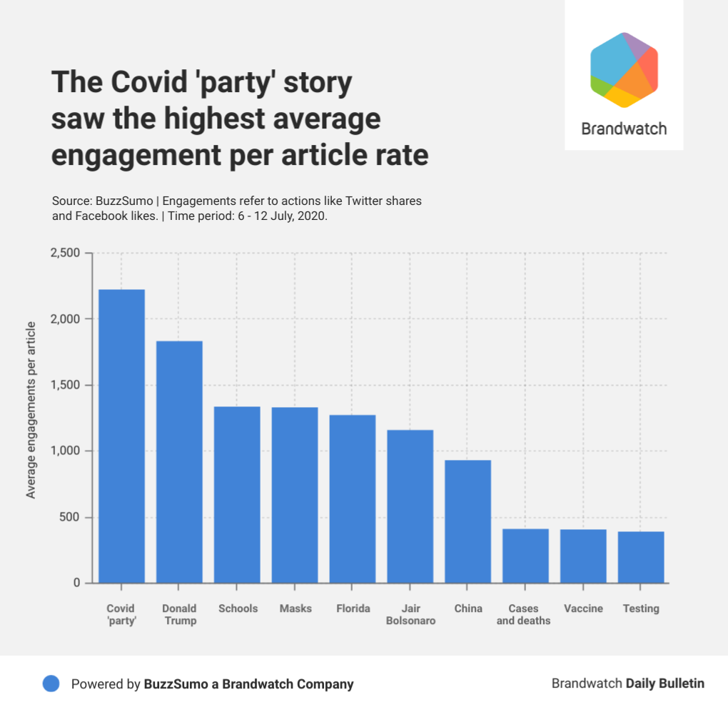 We’ve reported previously on how articles about cases and deaths receive a lot of engagements. This is unsurprisingly still the case as both numbers continue to rise and are seen as a measure of how well government bodies are tackling the virus. For example, Florida makes the list thanks to the state breaking their record for most cases recorded in a single day.