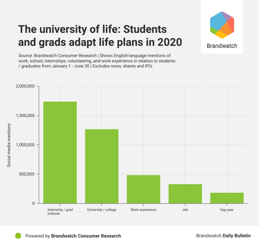 Popular topics in the internship/graduate scheme conversation included personal stories of getting internships (169k mentions), people talking about virtual internships (112k mentions), and postponed schemes (59k mentions).