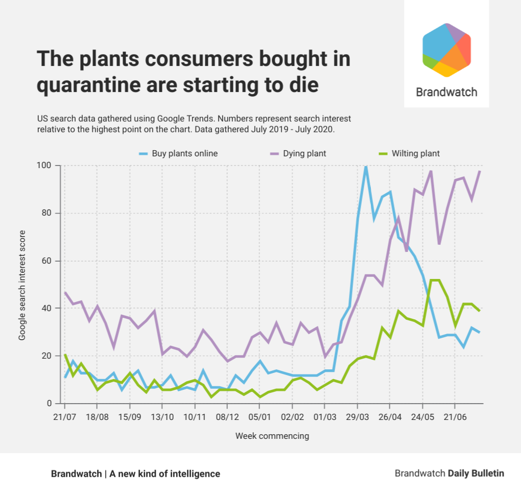 Looking at Google Trends data, we analyzed three key search phrases: “Buy plants online”, “wilting plant”, and “dying plant”, all of which have hit five-year-highs in the last few months.