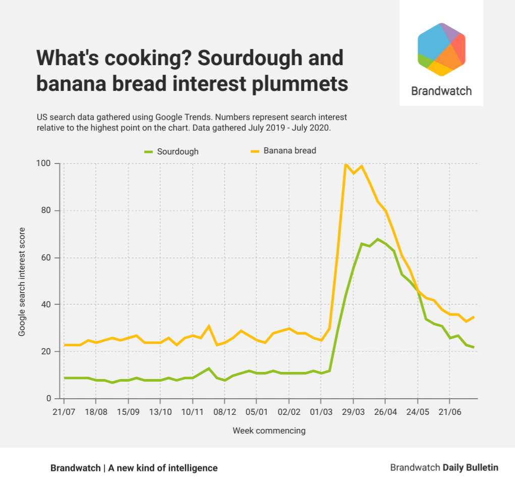 As you can see, banana bread had the largest and earliest spike in search interest, but it trailed off within a few weeks. Sourdough was slower to catch on and the spike wasn’t nearly as sudden, but it’s also taken a longer time to slow down.