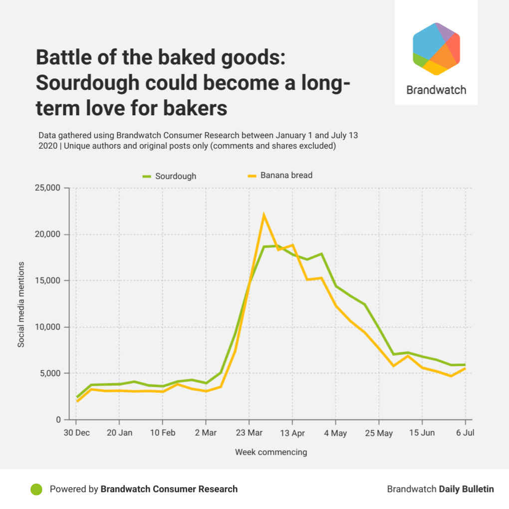 Social data tells a similar story – while banana bread hit a bigger peak, sourdough mentions eventually took over and the curve in interest over time was more long-lived.