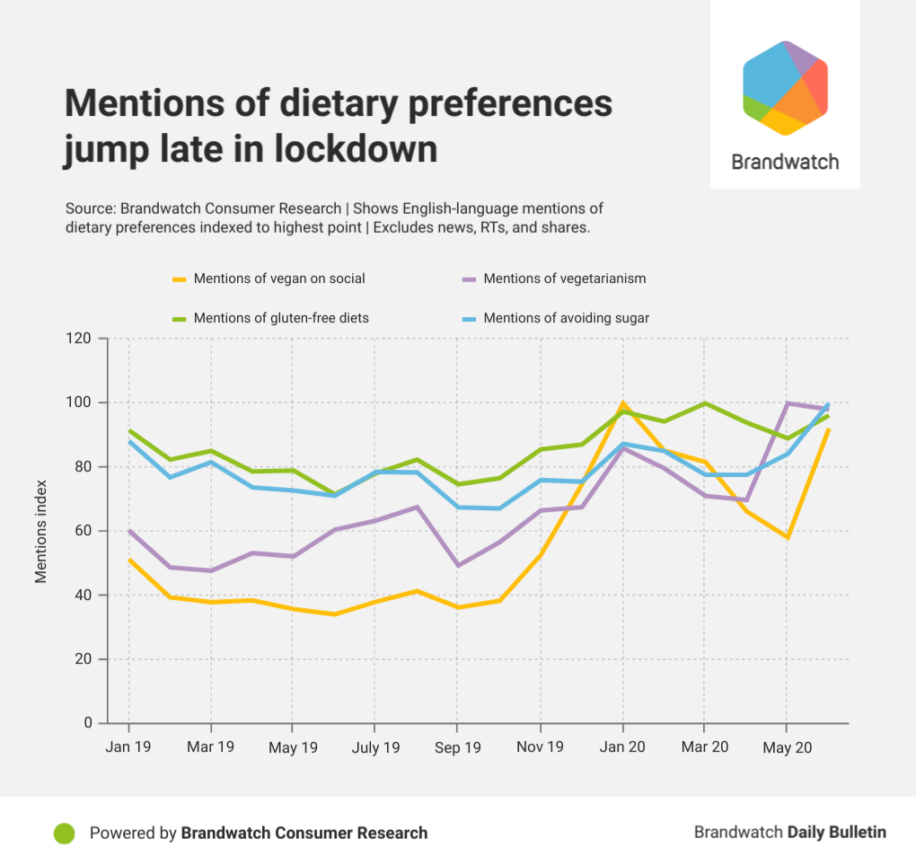 Perhaps unsurprisingly, we also saw that mentions involving sugar-free diets increased in the last two months, driven by consumers trying to resist sweet tooth cravings more than they would have earlier in lockdown.