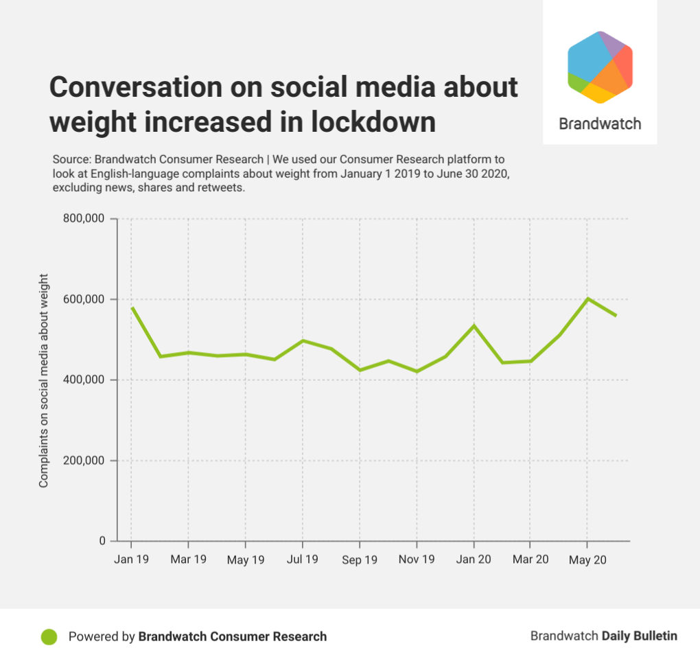 And complaints about weight gain hit an 18 month high on social media in May 2020, according to our Consumer Research platform (which searched for English-language mentions of weight gain from January 1 2019 to June 30 2020).