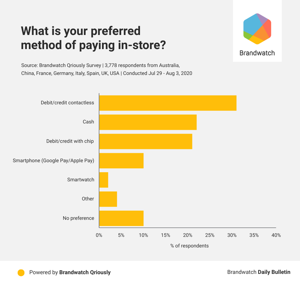 Contactless payments lead the pack by a wide margin in terms of preferred payment methods. This should be a big wake up call to any businesses that have yet to implement this technology. Having said that, cash and chip payments, which involve contact, make up 43% of first preferences. The old ways aren’t done yet.