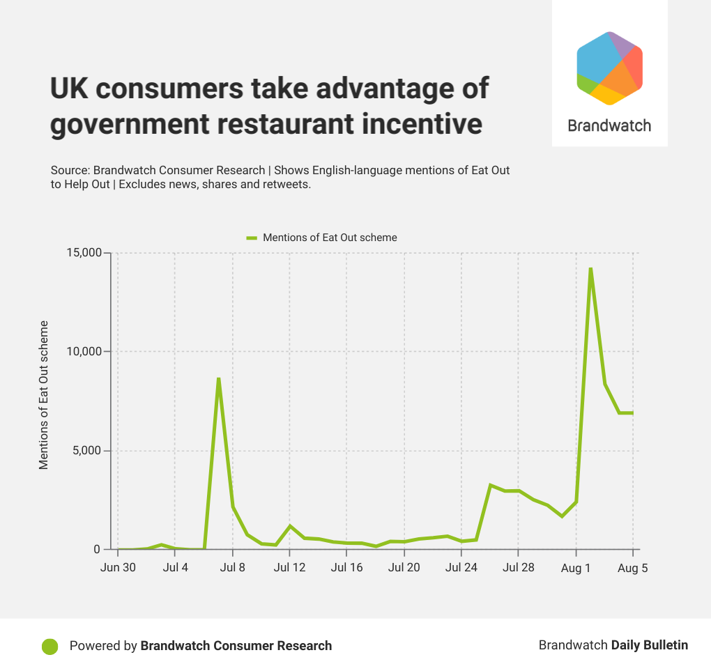 Using our Consumer Research platform, we looked at English-langauge mentions of the UK’s ‘Eat Out to Help Out’ scheme from July 1 to August 5 2020. We found that British consumers celebrated the launch and were making the most of the offer in its first three days.