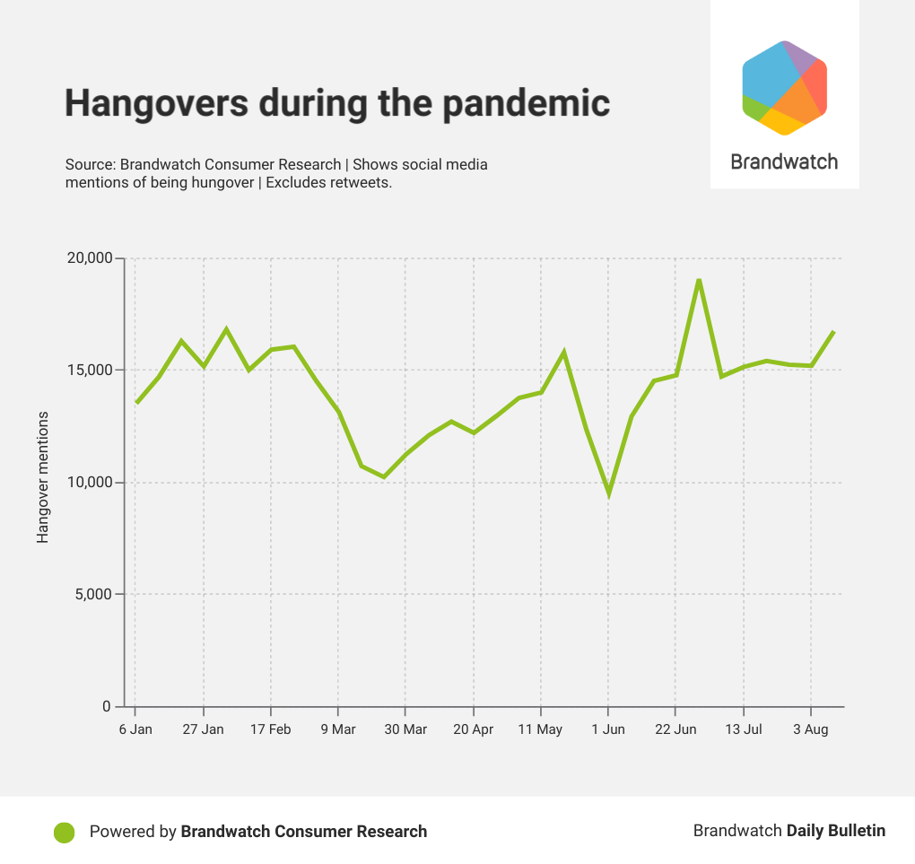 It turns out measuring online reports of hangovers is an effective way to track major events. In March we see a big drop off in people saying they’re hungover online, just as the pandemic was declared. Levels began a slow recovery shortly after as we started to adjust to Covid-19 and people began to find new, often online ways to socialize with alcohol.