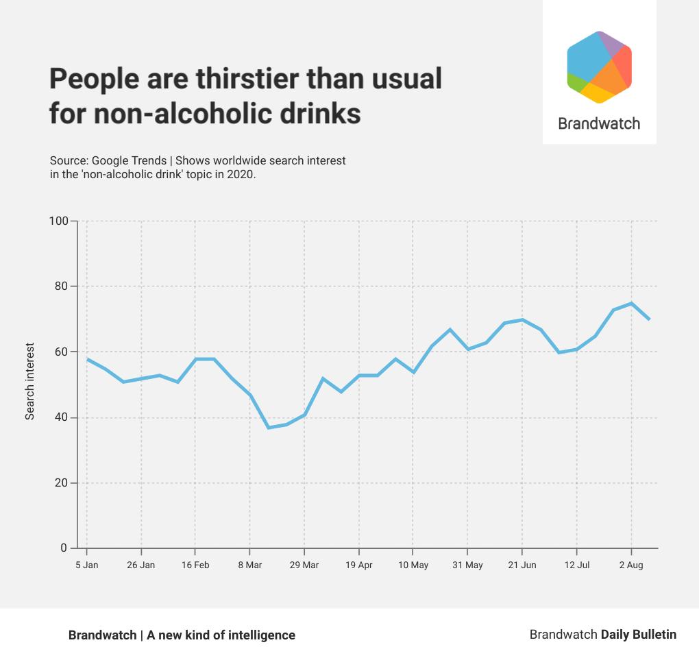 Levels returned to normal in the following week and have now generally stabilized, although last week saw a small jump. This could be a sign people are increasingly comfortable with returning to bars and pubs. That, or world events, such as new outbreaks and the looming US presidential election, have people turning to drink.