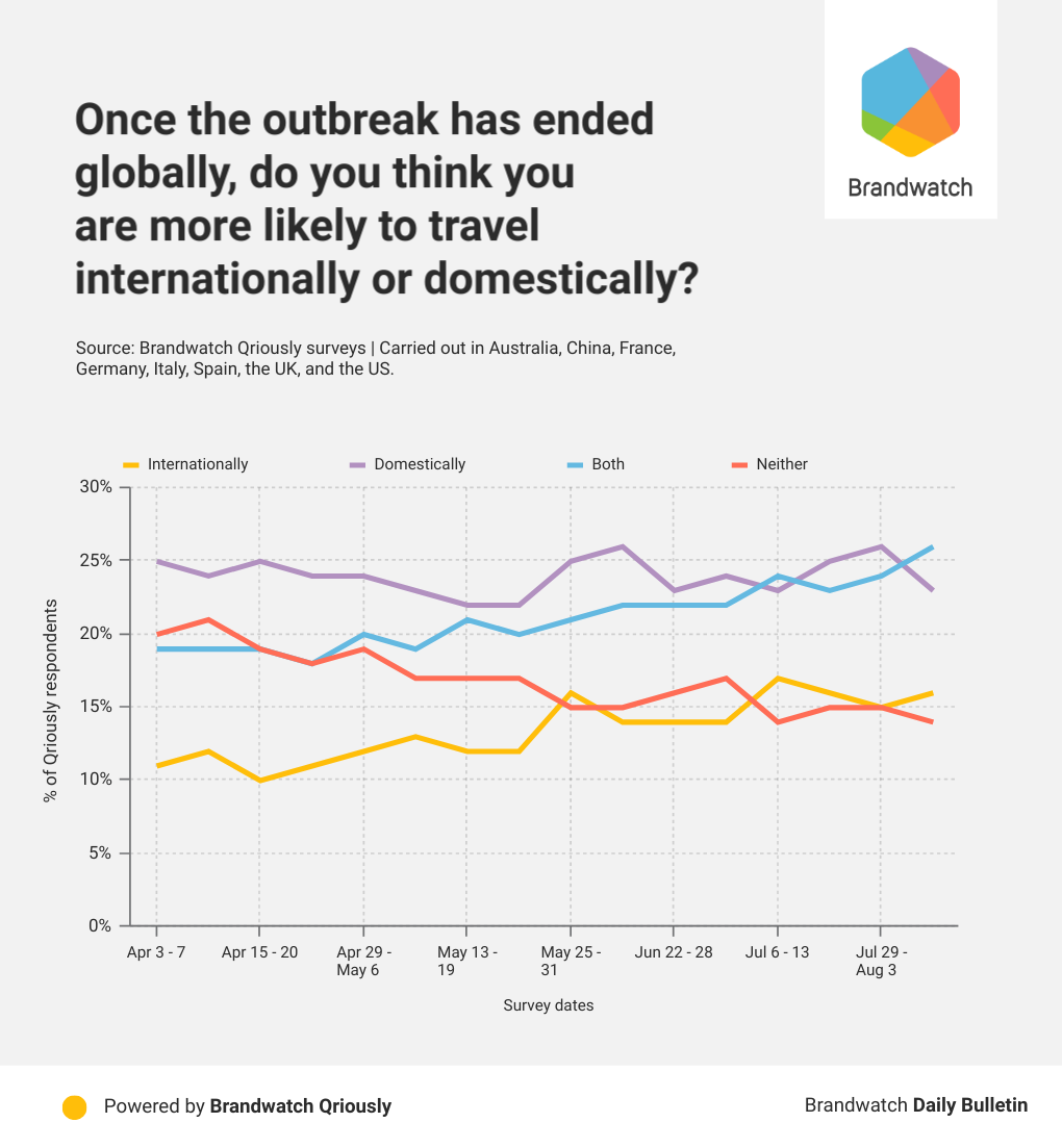 Confidence in travel has been falling for some time. One of our Qriously surveys, conducted between July 6 and July 13, asked 4,093 people in Australia, China, France, Germany, Italy, Spain, the UK, and the US how their travel behavior had changed, if at all, as a result of the outbreak.