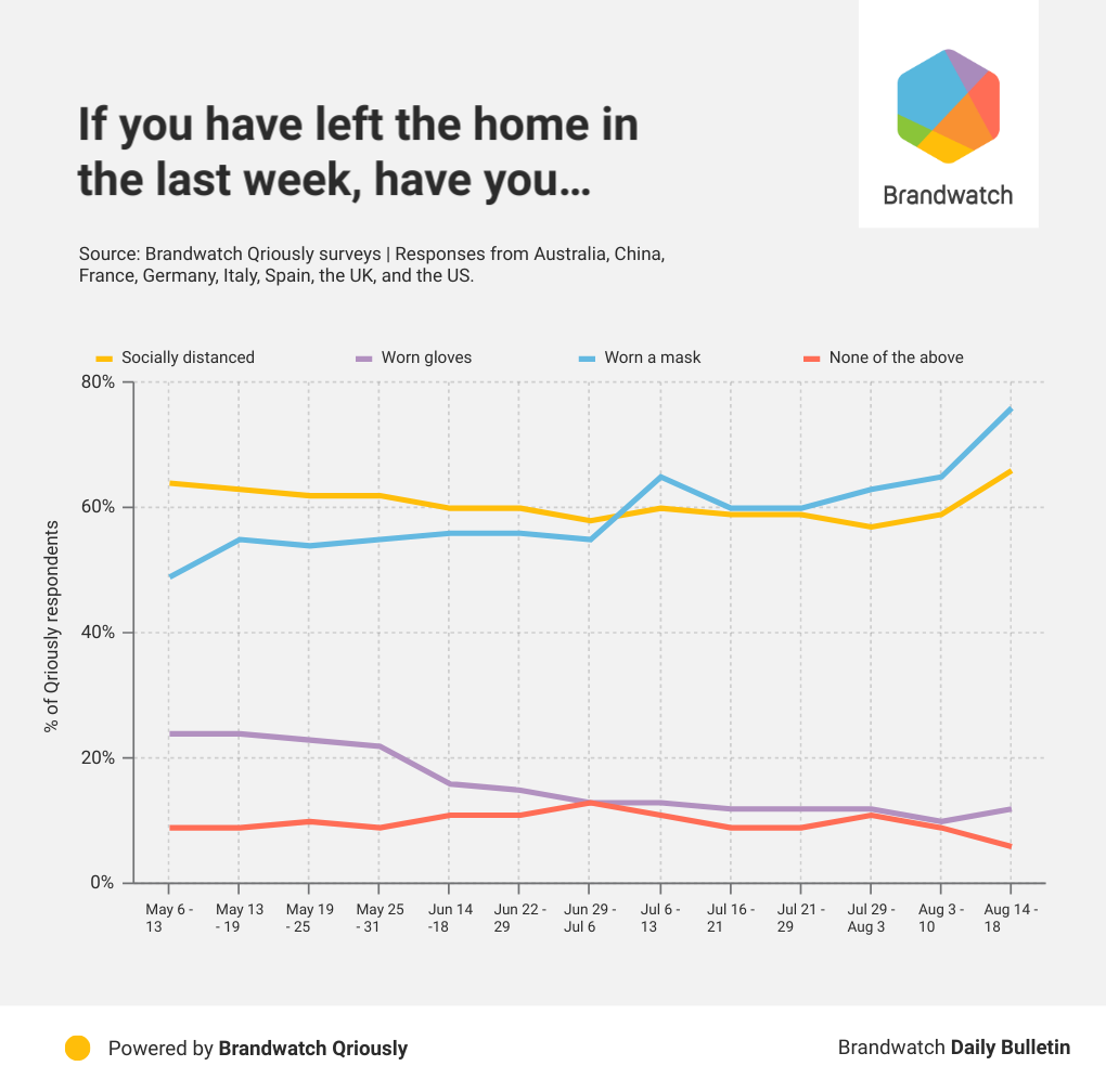 That said, there is one contradiction. We have seen glove usage drop by half since we first asked about PPE back in May. Looking at online conversation around glove use from March 1 to August 16 using our Consumer Research platform, we found that confusion was a big driver. Mentions focused on improper usage and questioned how hygienic the measure was.
