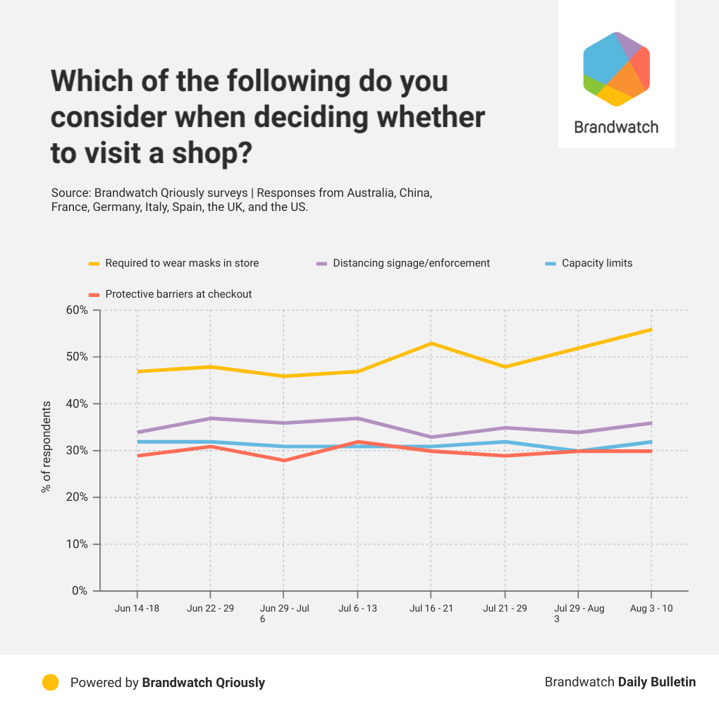 Another Qriously survey, running from August 3 to August 10, asked 4,265 respondents, “Which of the following do you consider when deciding whether to visit a shop?”.