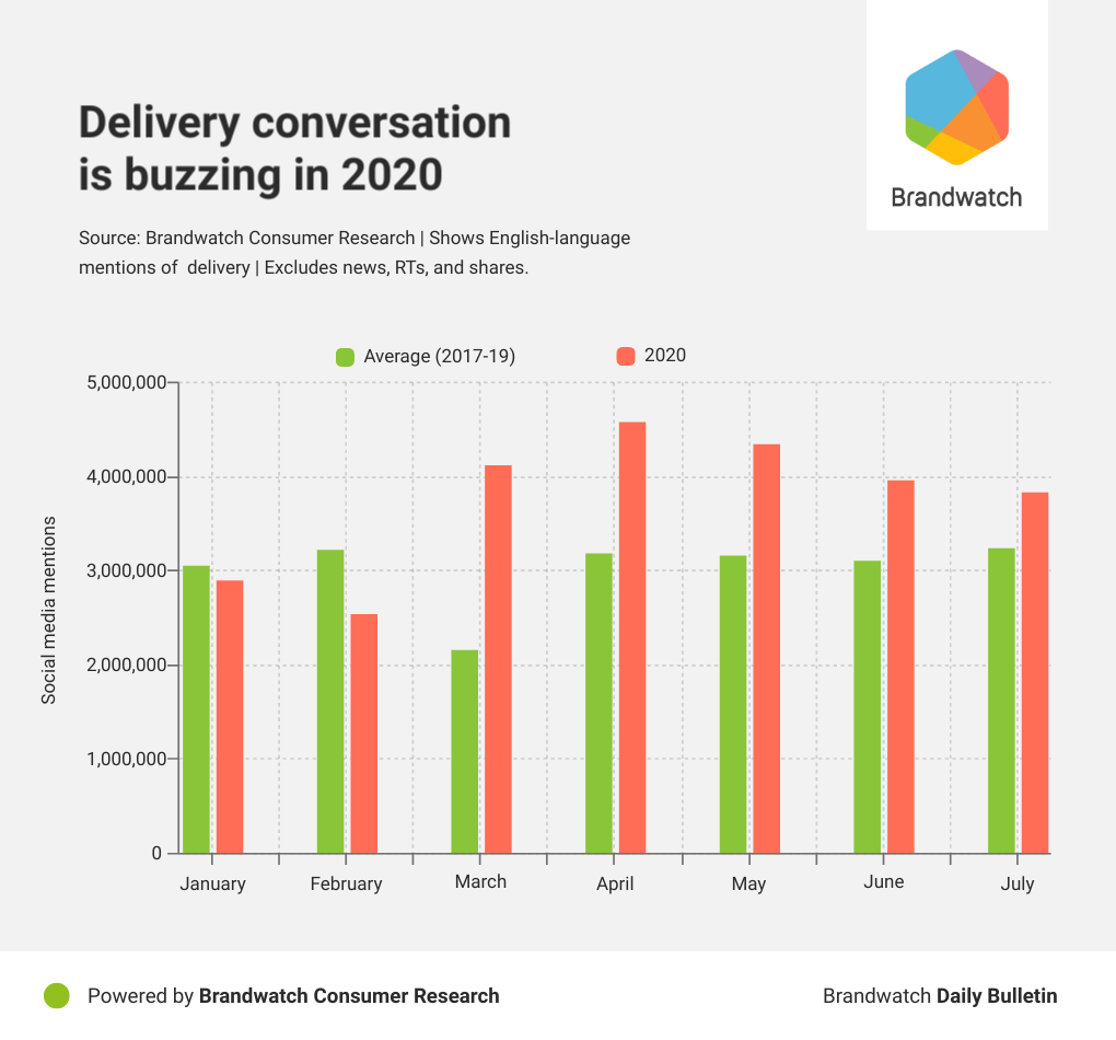 Meanwhile, uniting topics in general delivery conversation included customer service (2m mentions) and price (2m mentions).
