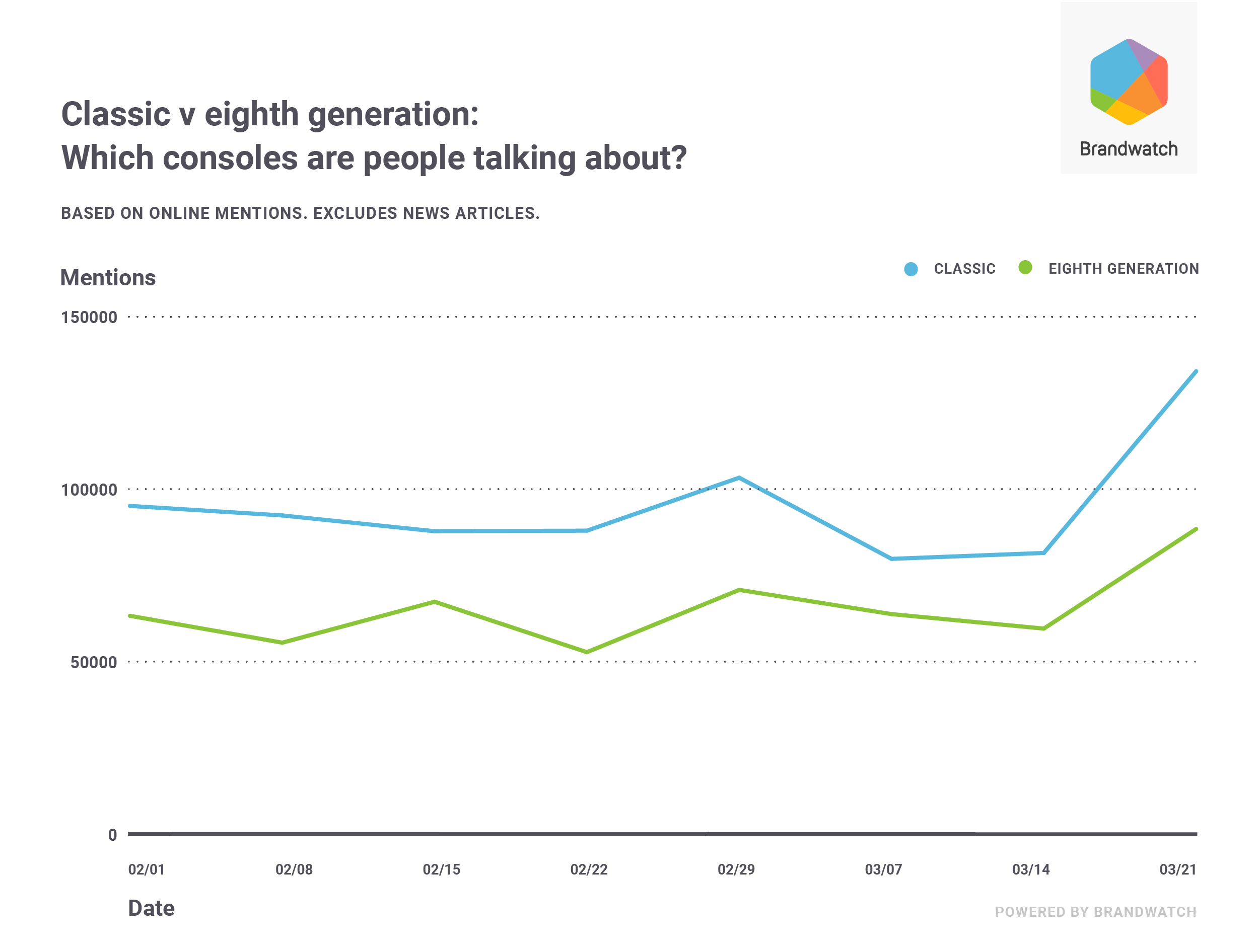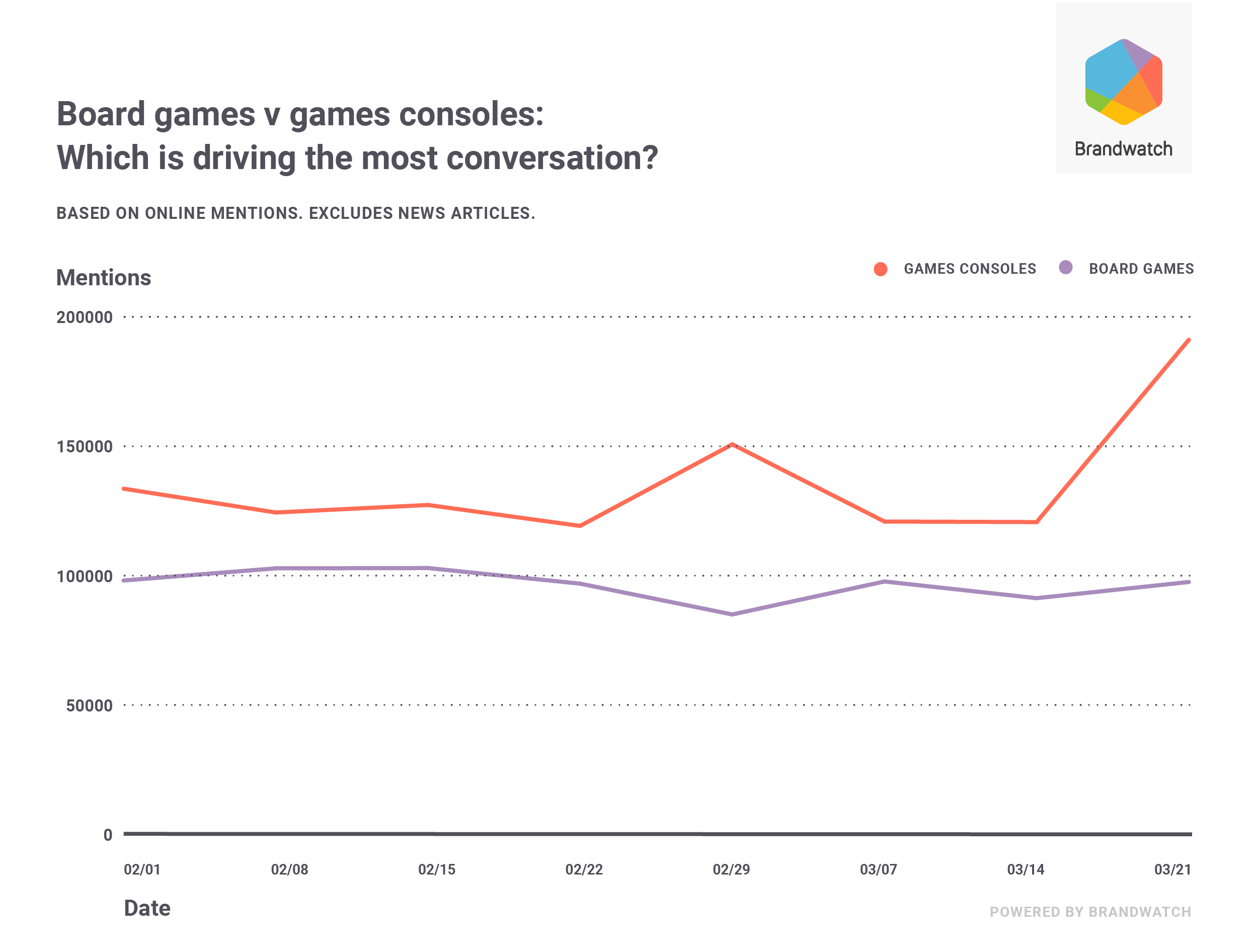 Studying the same time frame, we looked at emotion-driven mentions – specifically joyful ones. Of the mentions that Brandwatch automatically classified as emotion-driven, 20% of classic console ones, and 19% of 8th gen ones, were joyful. In comparison, board games invoked more joy on social media (22%).