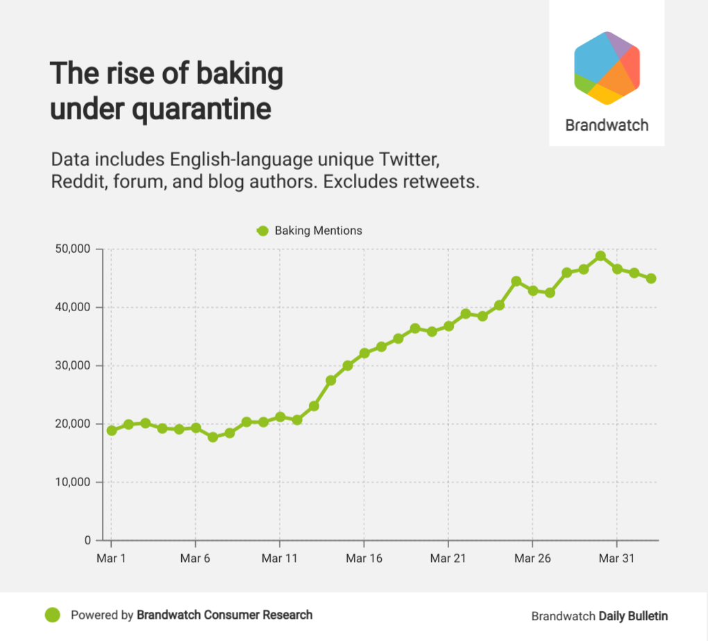 In the chart below, we can see how baking conversations climbed as people went into lockdown. It’s a much smoother rise than other topics we’ve previously looked at.