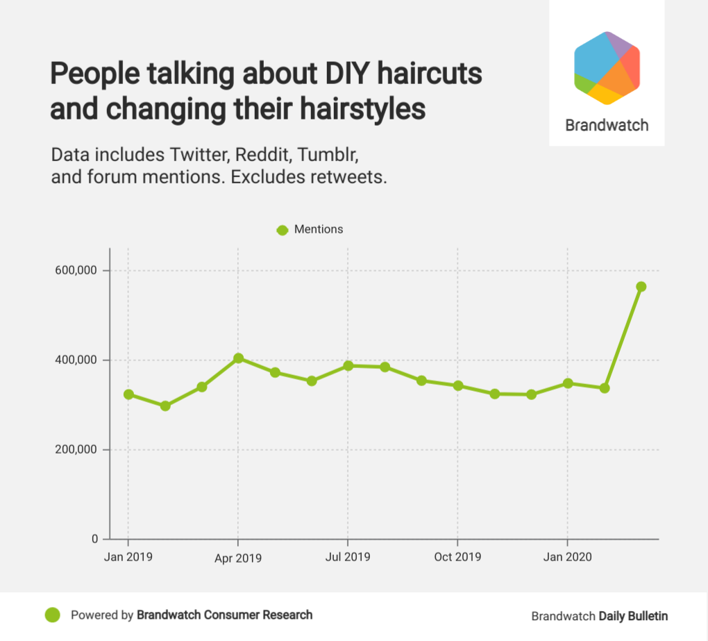 Yes, lockdown has come to this: Mentions of DIY haircuts and hairstyles have increased 55% since January 2019.