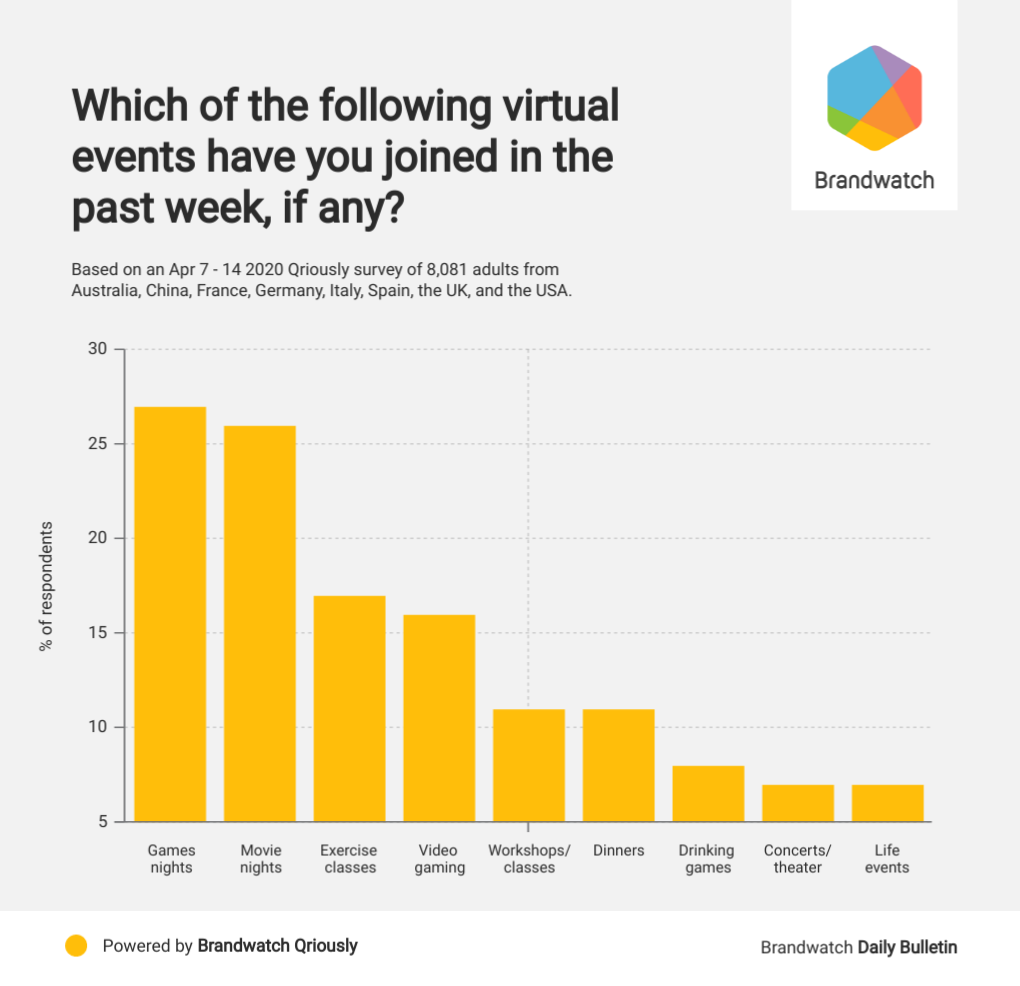 Generally, all countries show a significant amount of people turning to virtual events to keep their social lives going. As lockdowns are eased in some countries, it’ll be interesting to see if any of these activities stick.
