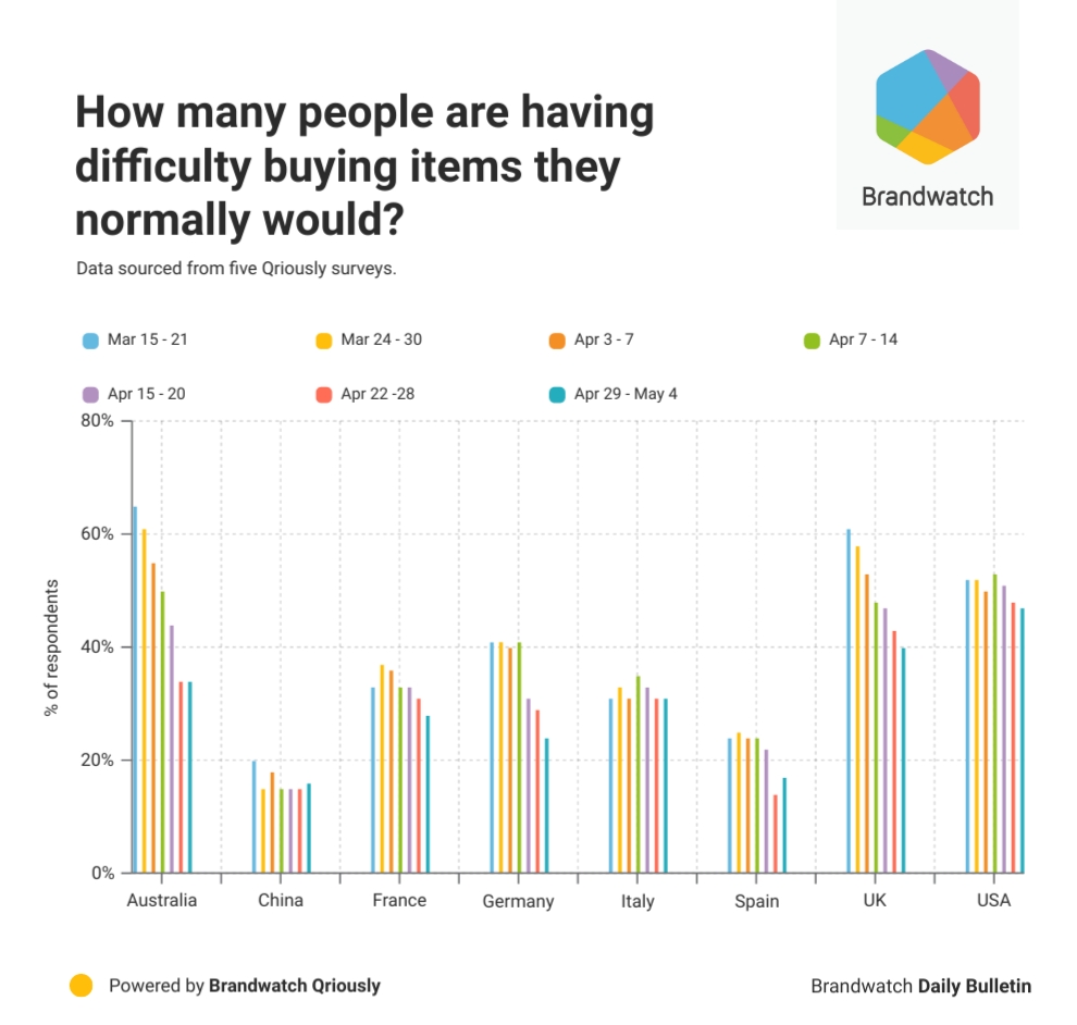The UK sits on the other end of the spectrum. The country is still reporting high levels of relative avoidance, sitting at 68%. While avoidance is slightly up this week, they’ve seen a bigger drop over time, having previously reported a figure of 74% in our April 7 – 14 survey.
