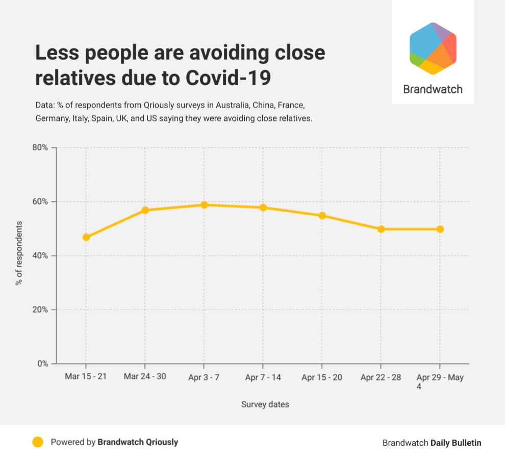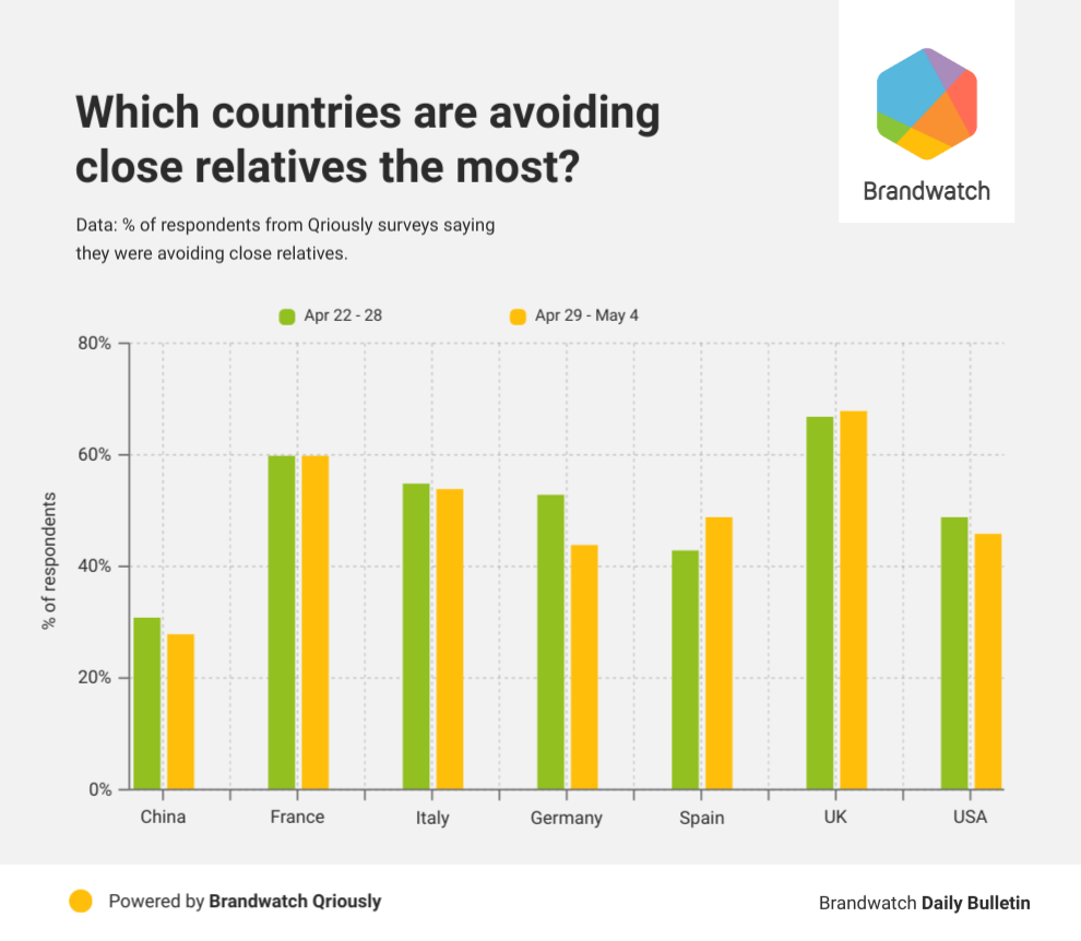 China stands out with the lowest number of people avoiding close relatives. Their latest figure of 28%, compared to the 44% we recorded in our March 15 – 21 survey, reveals a significant drop that marries with the country’s falling case numbers and the easing of restrictions.