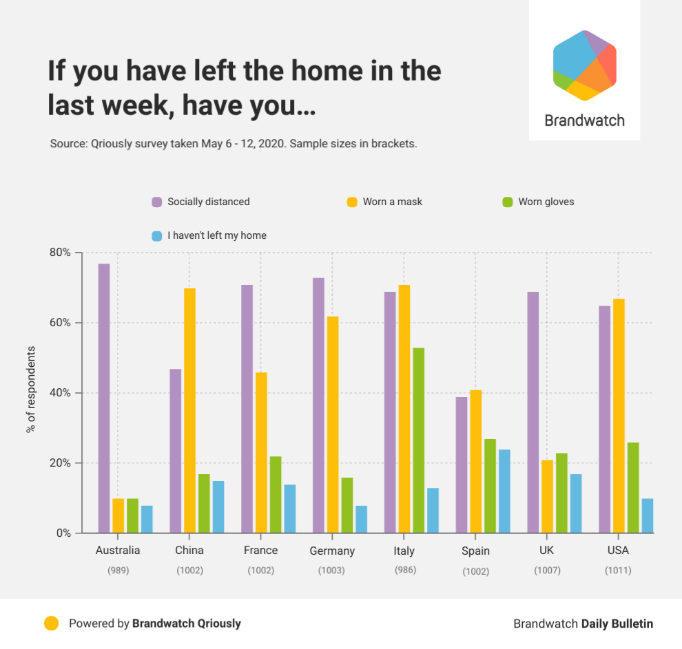 Using Qriously, we decided to find out what actions people are taking to protect themselves and others while outside their homes. To do this, we surveyed 8,005 people from Australia, China, France, Germany, Italy, Spain, the UK, and the US through their smartphones and tablets.