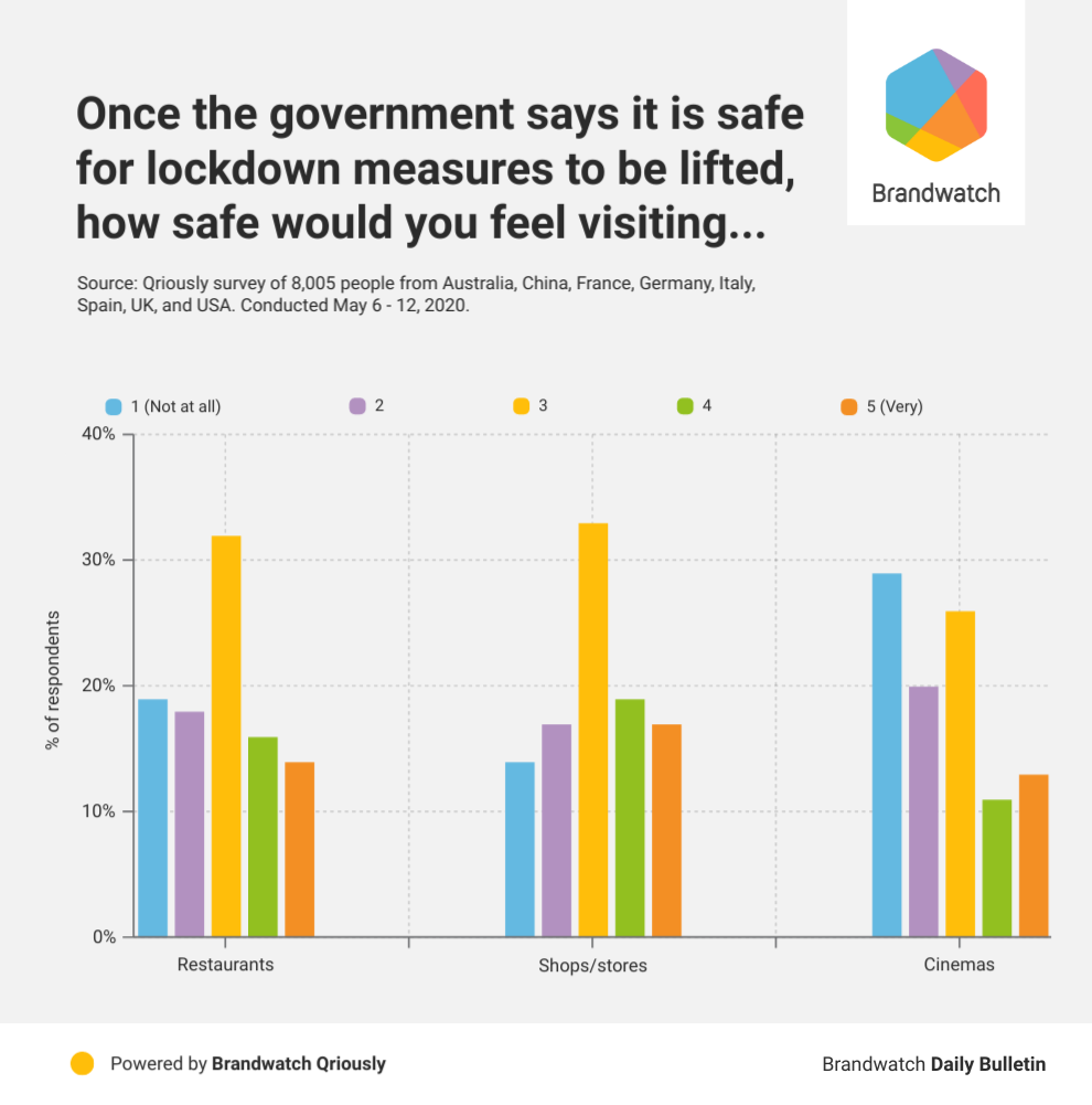 In the same Qriously survey we mentioned earlier, we also asked people about how safe they’d feel visiting certain premises and businesses once lockdowns were lifted. They rated this from 1 (Not at all) to 5 (Very).