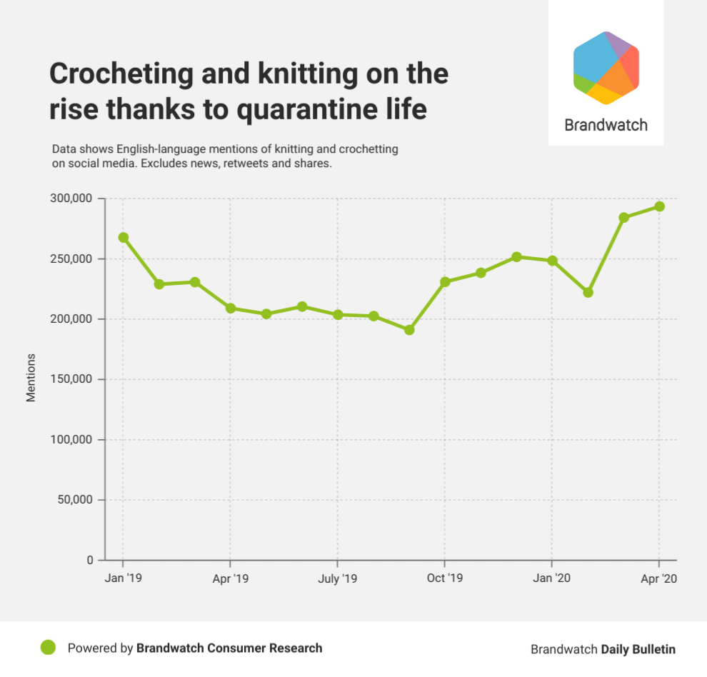 Knitting and crocheting were consistently talked about on social media before the pandemic struck. But because of stay at home orders, mentions on social media jumped in March and April, up 17% and 101% year-on-year, respectively.