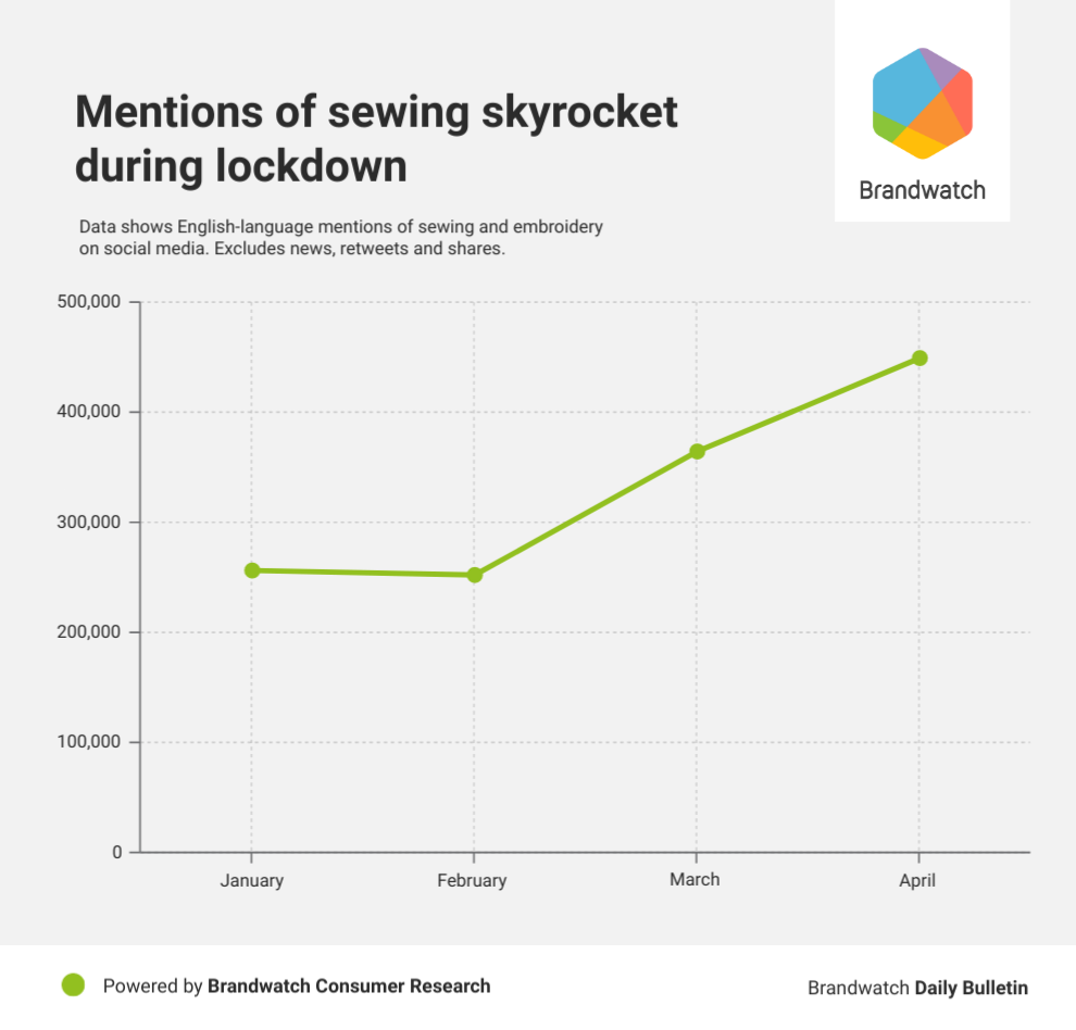 The number of English-language posts discussing sewing and embroidery increased by 68% in March and April compared to January and February.