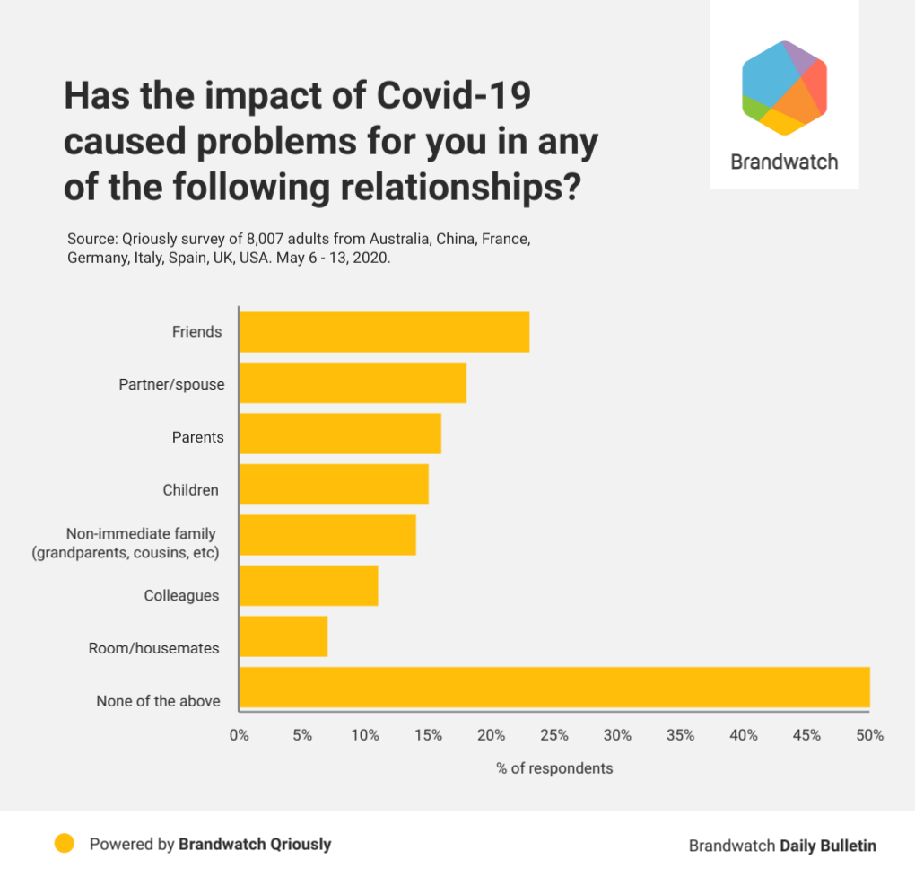 Using Qriously, we wanted to get a better idea of how people’s relationships with their friends and family were being affected. Through their smartphones and tablets, we surveyed 8,007 adults from Australia, China, France, Germany, Italy, Spain, the UK, and USA on the subject.
