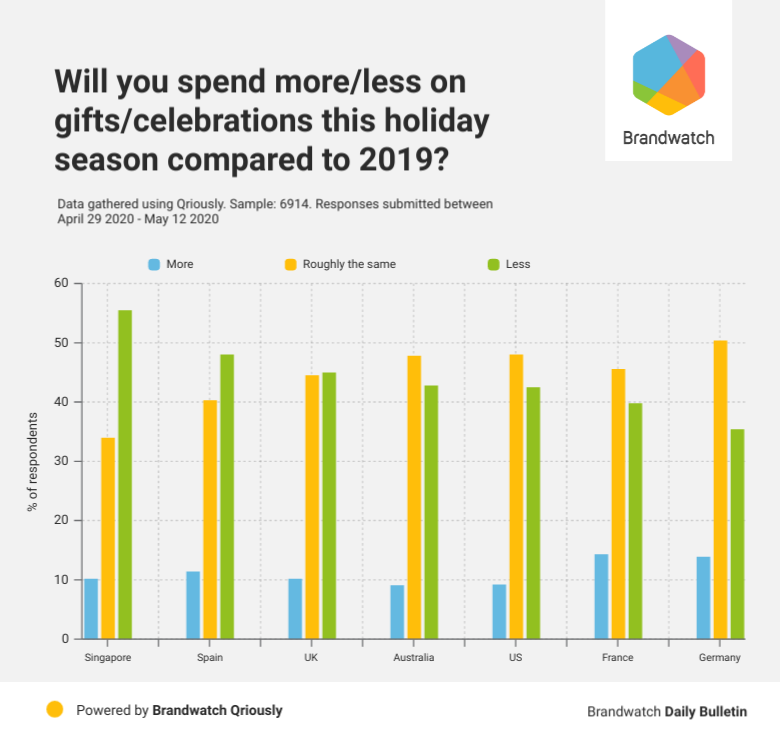 Meanwhile, those in Singapore, Spain, and the UK were most likely to say they’ll be spending less in the holiday season this year. These countries also had the least people selecting ‘Roughly the same’ as an option.