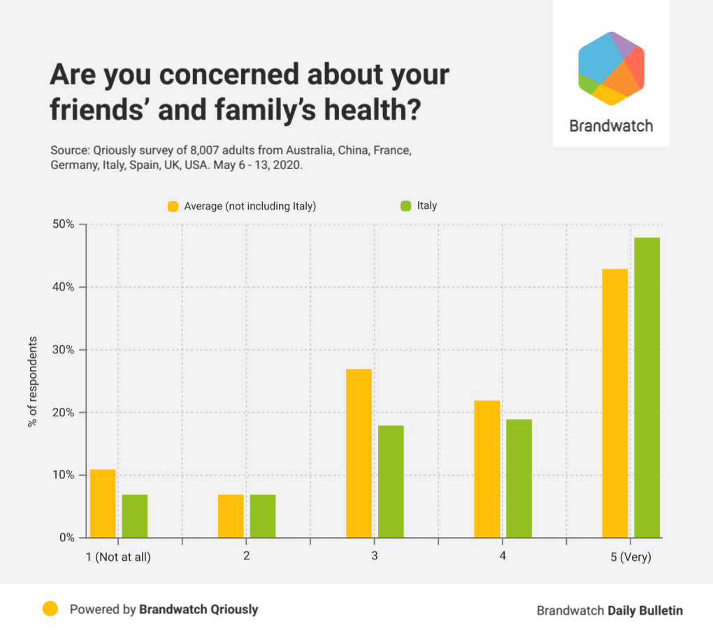 Italians are more likely to be very worried about the health of their friends and families, with 48% of them choosing this option compared to the 43% average. (Though obviously both are high figures and are taking a mental toll on people). While there may be more friction in relationships in Italy, there’s no shortage of care.