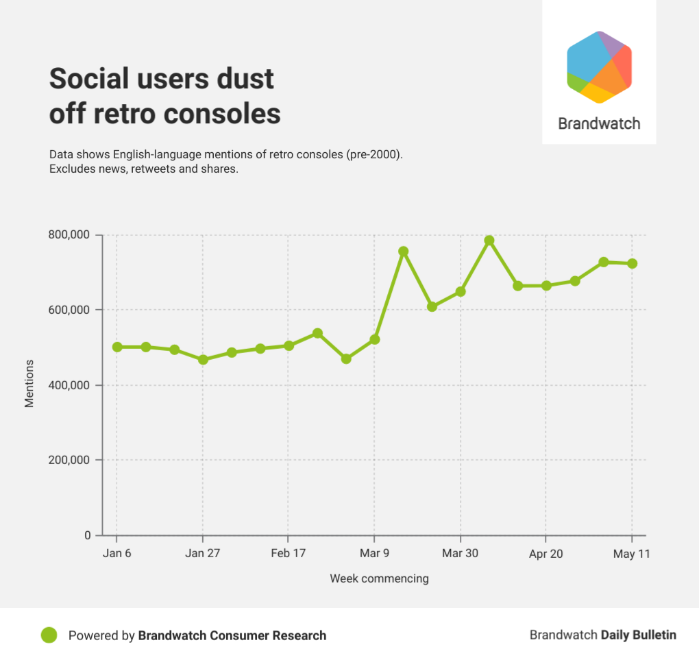 Consumers are trying to make the most of their time during lockdown. Retro consoles take consumers back to a happier time, and discussing them online provides a fun outlet to connect (especially for anyone looking to escape gloomy news reports).