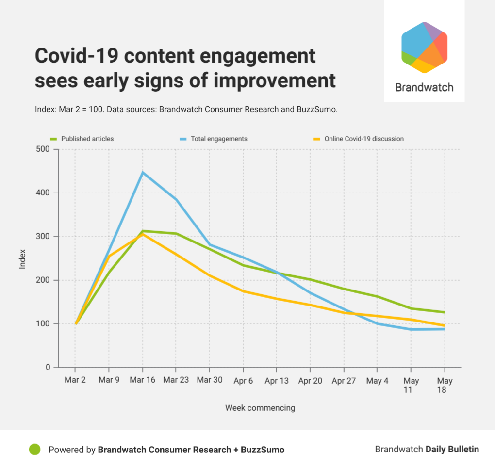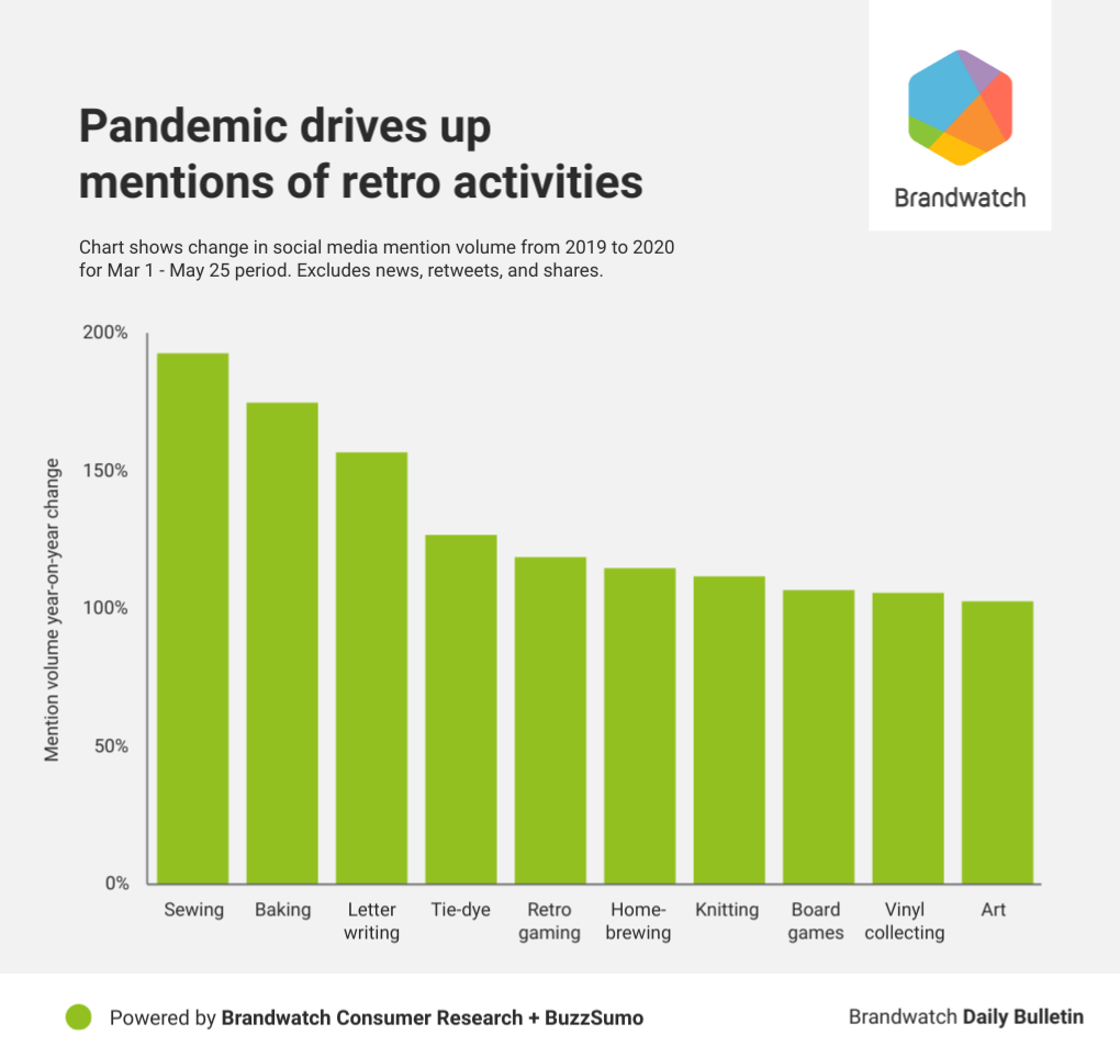 Letter writing had the third largest % increase. In case you missed our Daily Bulletin on May 22, we learned that a huge number of people were putting pens to paper to help cope with the stress and anxiety caused by the pandemic. Mentions of letter writing increased 157% in the period we studied in 2020 compared to that period in 2019.
