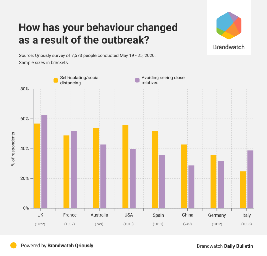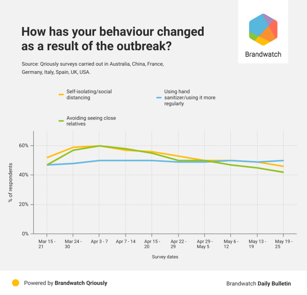 When it comes to self-isolating, social distancing, and avoiding seeing close relatives, there’s a distinct trend. The number of people reporting this behavior jumped at the end of March as national lockdowns were enforced in Germany, Australia, and the UK, and peaked the following week.