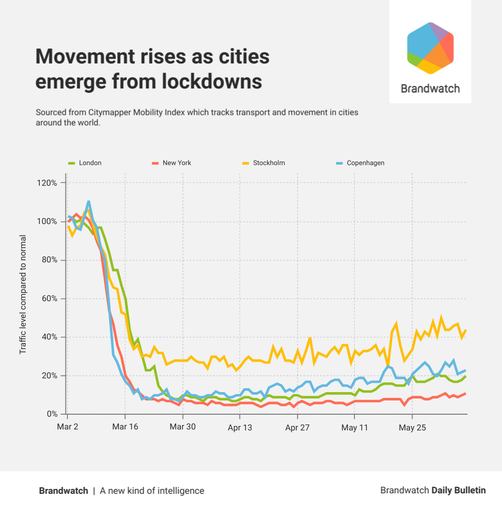 But, as some restrictions have been lifted, we’ve seen consumers more willing to leave their homes. Since April 27, travel in Stockholm has increased by 36%. This is in comparison to London, New York, and Copenhagen, which have seen mobility increases of 14%, 18%, and 19% respectively from April 27 to June 7.