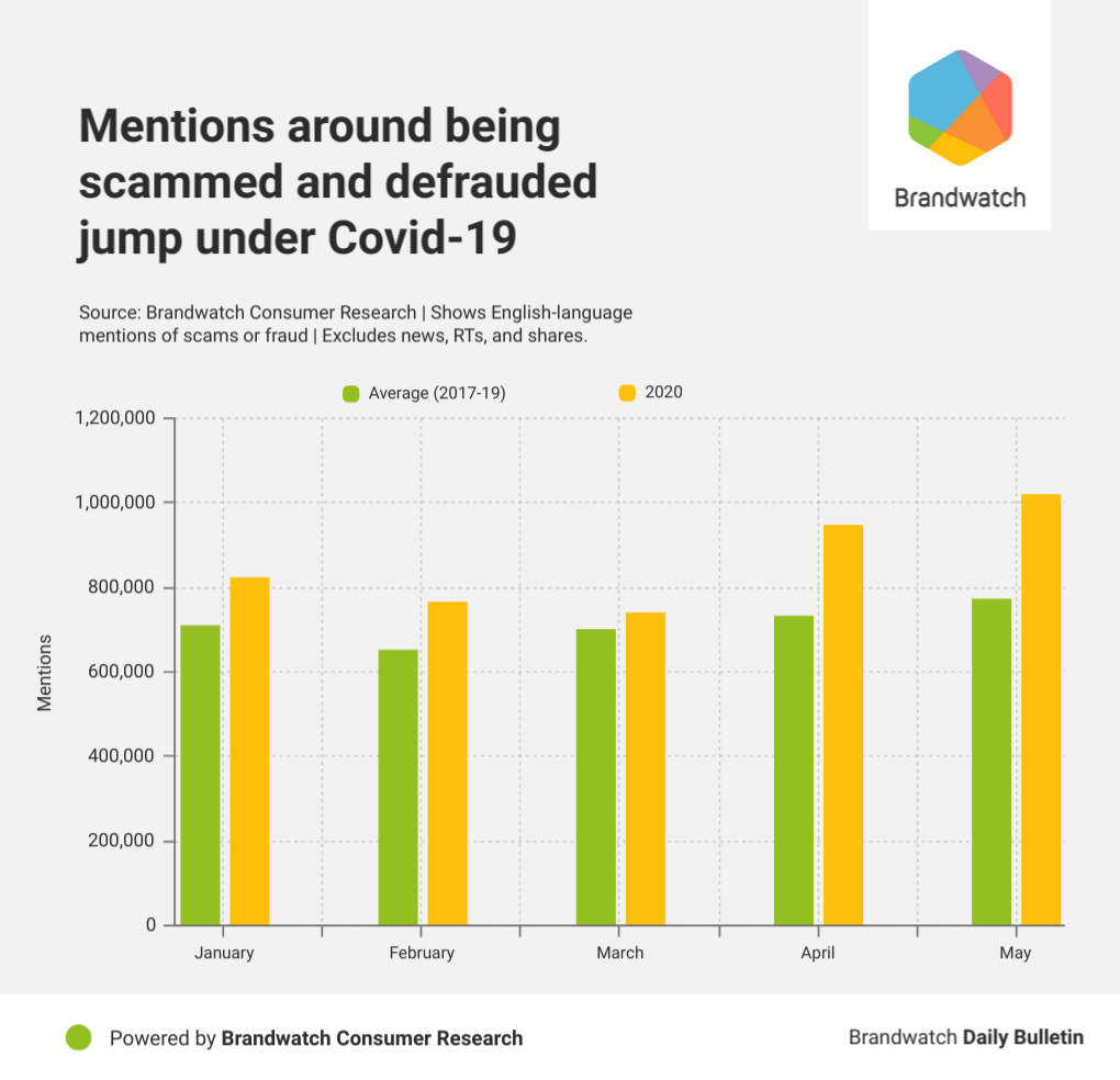 For the March to May period, mentions of people falling victim to scams were up by 23% in 2020, compared to the average for the same period 2017-19. This suggests criminals could be specifically using the pandemic to prey on more people.
