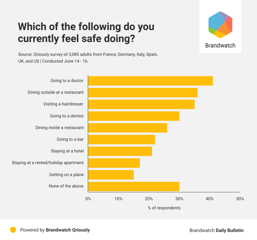 Evidently there is a lot of trepidation, with 30% of respondents saying they wouldn’t feel safe doing any of the activities listed.