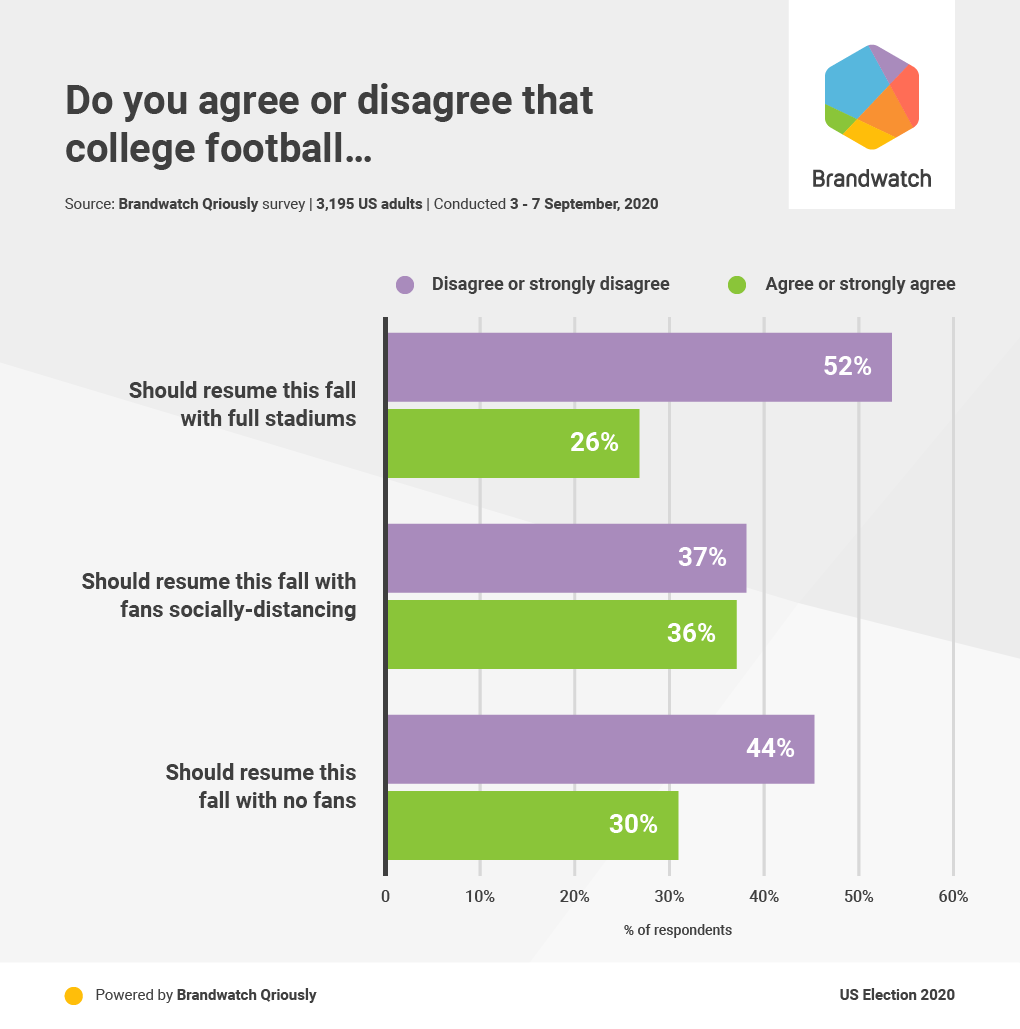 As part of this week’s survey, we asked Americans about their views on college football – specifically on whether it should resume and in what way fans should be able to spectate.