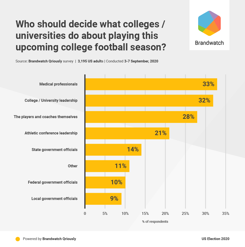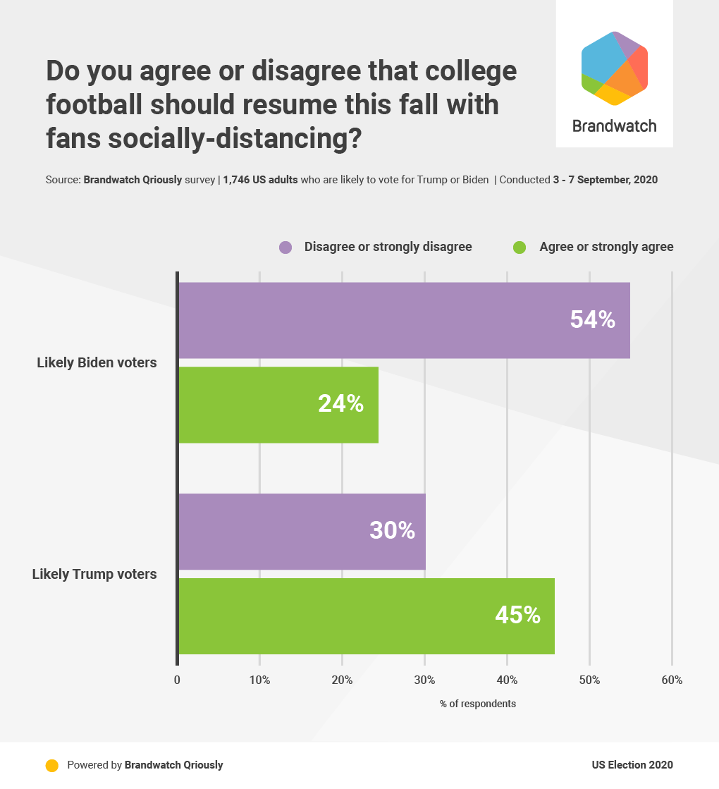 Using our Consumer Research platform, we found that Covid-19 contributed to a jump in online discussion around college football this August. Over 93k unique authors took to blogs, forums, and social media to talk about the coming games, compared to just 70k in the same month last year. 15% of August 2020 mentions around upcoming games mentioned the virus or pandemic.