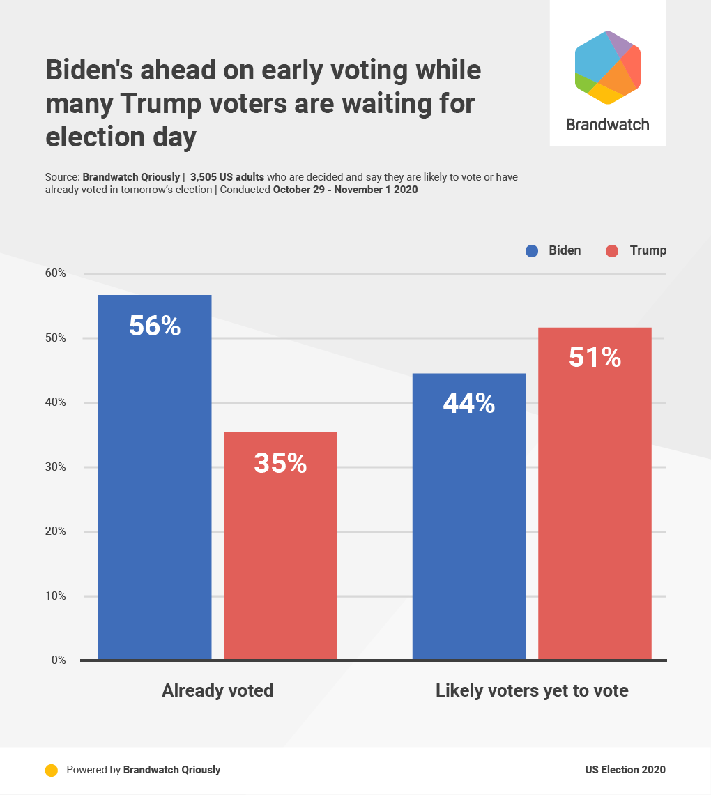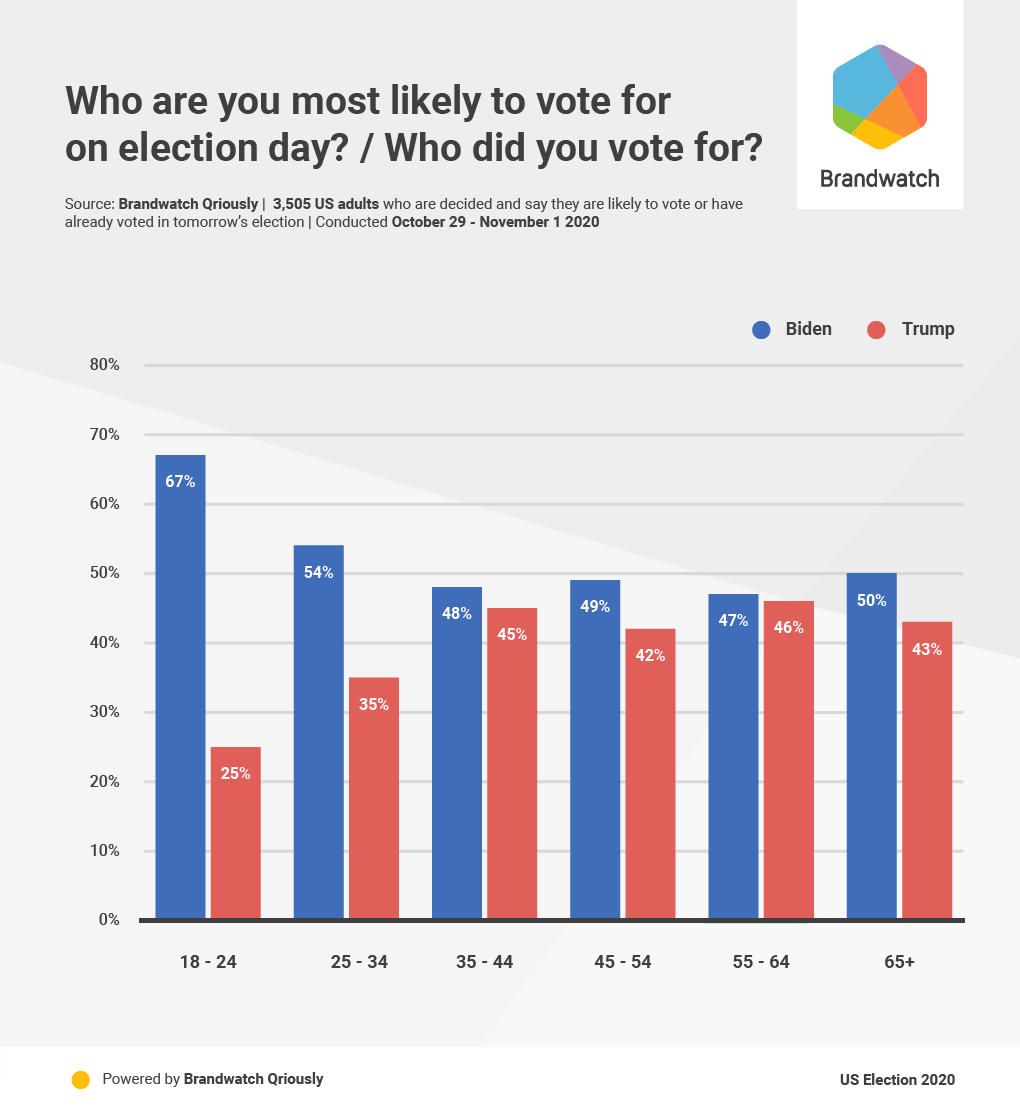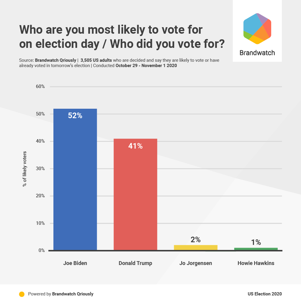 About the poll: 5,409 adults aged 18+ nationwide were surveyed from October 29 – November 1 2020. The size of the subsample of decided likely voters was 3,505. Data was weighted to be nationally representative in terms of age, gender, education, race, geographical region (census division), and NCHS urban/rural community type, using data from the Census Bureau’s American Community Survey (ACS), as well as 2016 Presidential election vote (or non-vote). Targets for 2016 vote were calculated using results from the Federal Election Commission, population totals from ACS and mortality data from the National Centre for Health Statistics. The margin of error at the 95% confidence level, taking into account the effect of weighting, is +/- 1.8 percentage points for estimates from the full sample. For the subsample of decided likely voters it is +/- 2.2 percentage points. Sampling error can be larger for subsets of these samples. In addition to sampling error, all polls are subject to a range of other potential sources of error. When percentages do not sum to 100% this is due to the effect of rounding.