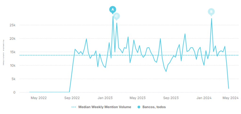 Estas menciones se recogieron gracias a una query que engloba los principales bancos en España. Para ello hemos utilizando Brandwatch Consumer Research. Las menciones abarcan del 1 de abril de 2022 al 1 de abril de 2024.