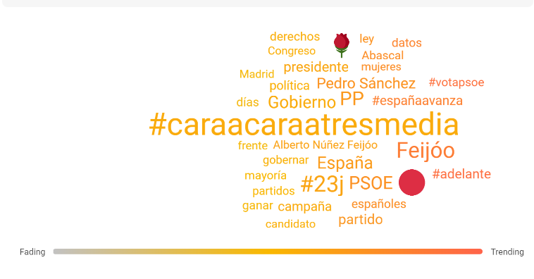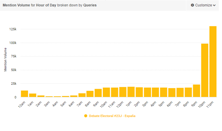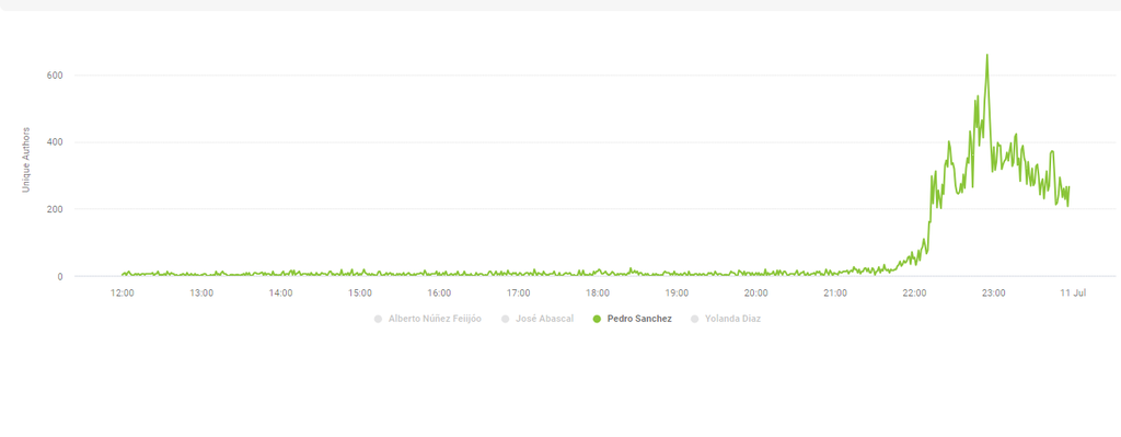 El pico asociado a su conversación se dio a las 10:55 pm, y contempla temas relacionados con los resultados económicos y de desempleo, diferencias en el apoyo entre PP y PSOE a diferentes leyes como igualdad o violencia contra las mujeres y la forma de afrontar el debate del candidato.