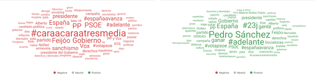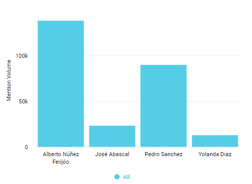 Santiago Abascal y Yolanda Díaz: Como adelantábamos, a pesar de no haber formado parte del debate, ambos candidatos también protagonizaron parte de la conversación digital. El líder de VOX obtuvo 23.67 K menciones, frente a las 13.01K menciones de la representante de SUMAR.
