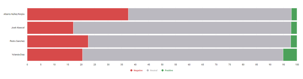 En cuanto al sentimiento asociado a la conversación sobre Santiago Abascal, se categorizó en un 18% como negativa, frente al 21% de Yolanda Díaz, quien además obtuvo un 6% de menciones positivas mientras que el candidato Abascal solo obtuvo un 2%.
