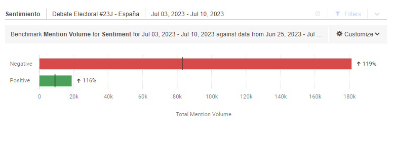 A las 10 pm (96k menciones) y 11 pm (127K menciones) se alcanzaron los mayores picos de conversación. Si observamos el sentimiento que despierta la conversación con respecto al debate podemos decir que es altamente negativo. Se incrementó, de hecho, en casi un 120% el mismo día del debate.