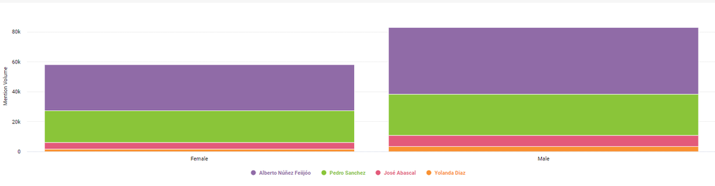 Además, las mujeres son las que más menciones realizan sobre Alberto Núñez Feijóo, mientras que los hombres destacan por sus menciones a Pedro Sánchez.