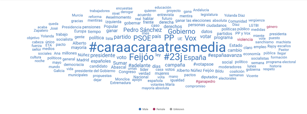 Con respecto a los temas más destacados en las distintas conversaciones por género, al haber mayor volumen de conversación en el género masculino, es mayor el número de términos asociados a este género. En cuanto a la conversación de género femenino destacan los términos violencia, género y #ganapedro.