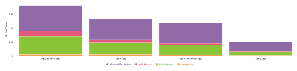 La generación Z es la que menos participa en la conversación y solo la centra entre Alberto Núñez Feijóo, Pedro Sanchez y Santiago Abascal. Por el contrario, los baby boomers son los que más participan y por ende también aumentan sus menciones a los diferentes candidatos, en este caso también hay menciones a la candidata Yolanda Díaz.